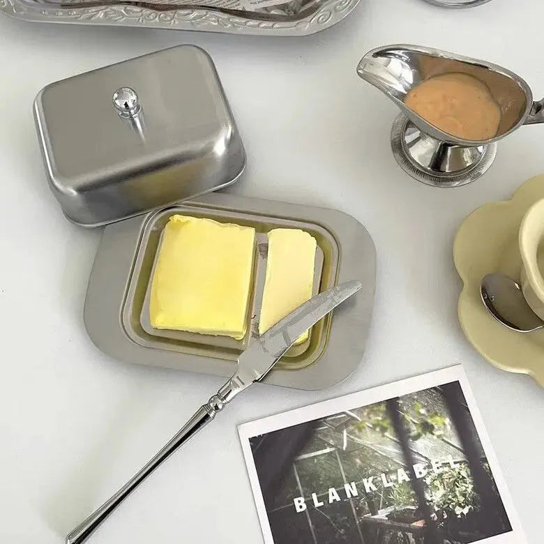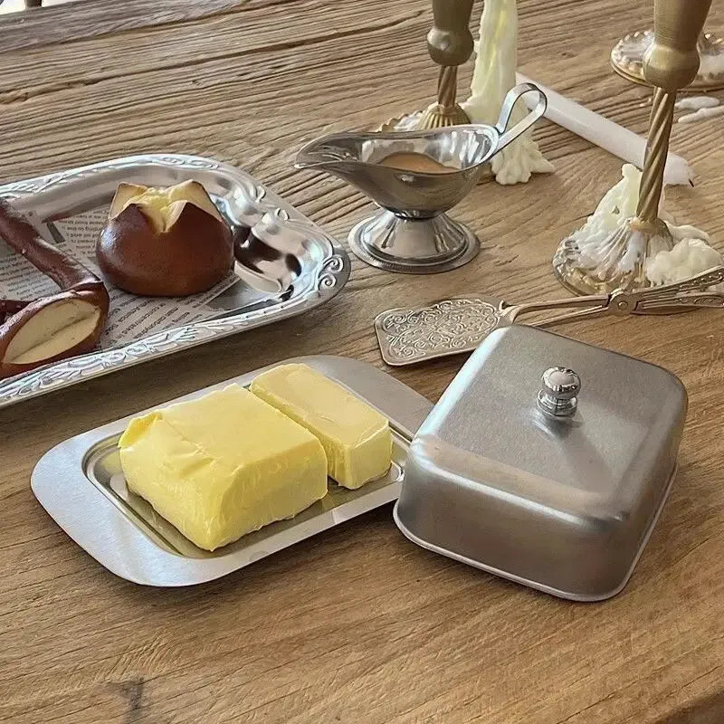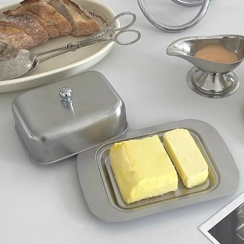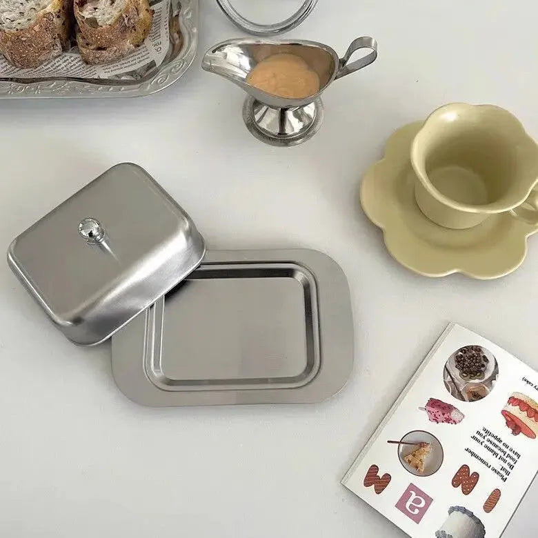 Beurrier inox élégant et pratique, idéal pour conserver le beurre avec style.