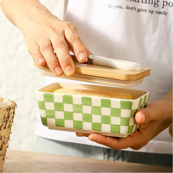 Beurrier original en céramique avec couvercle en bois et couteau inclus, idéal pour conserver et servir le beurre avec style.