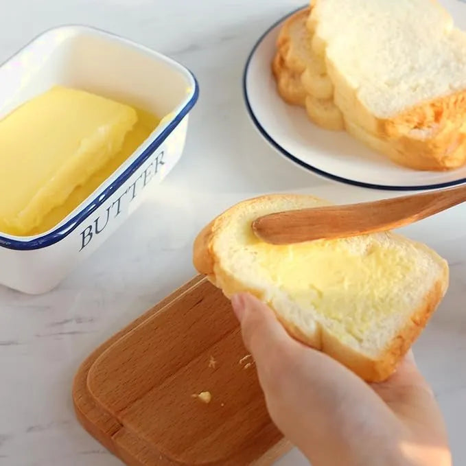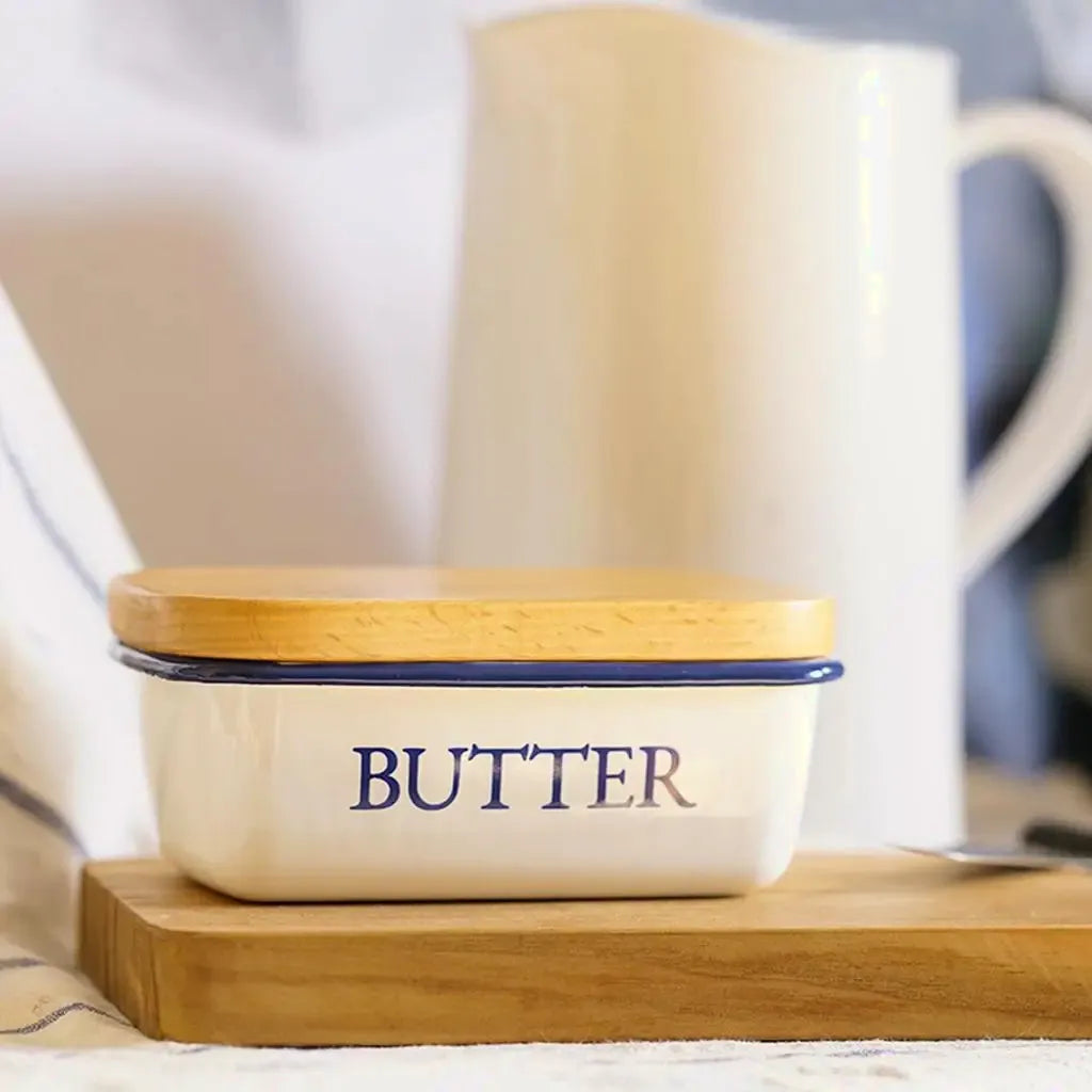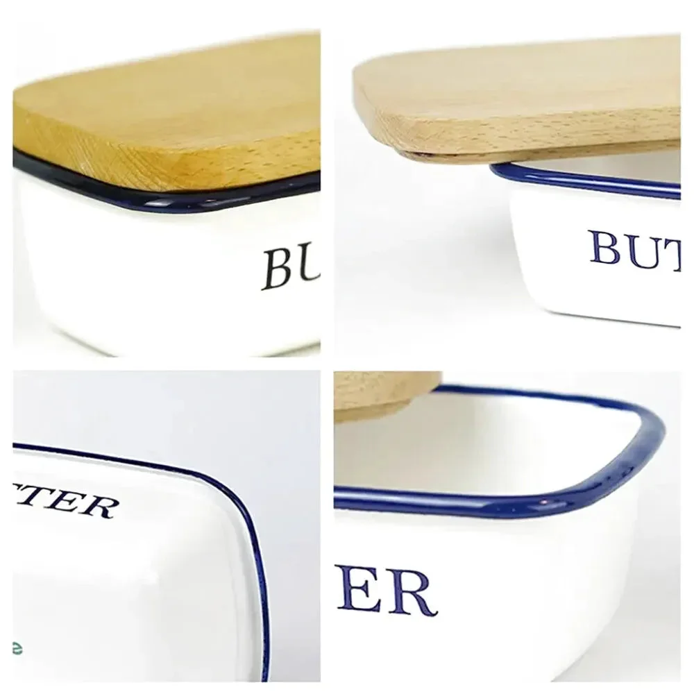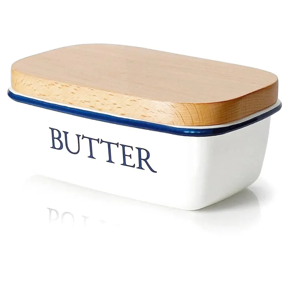 Boîte à beurre en émail avec couvercle en bois, idéale pour conserver et présenter le beurre avec style.