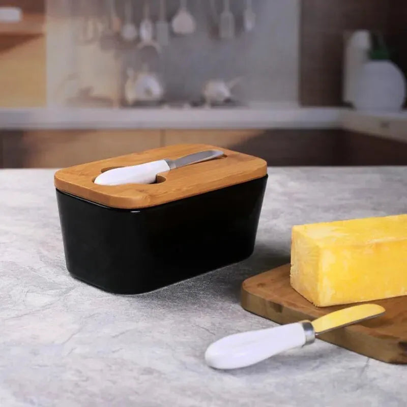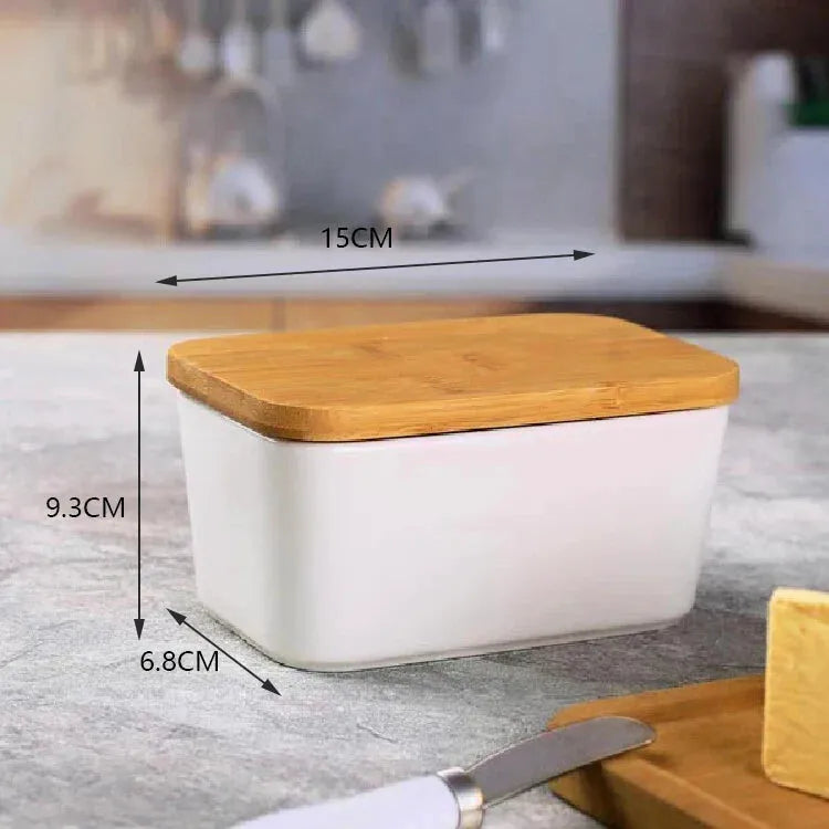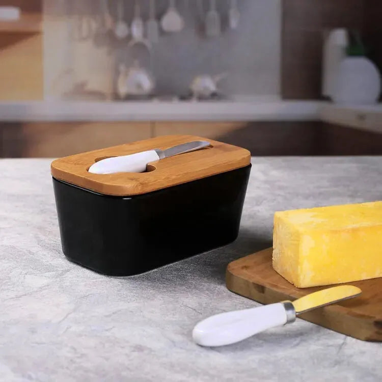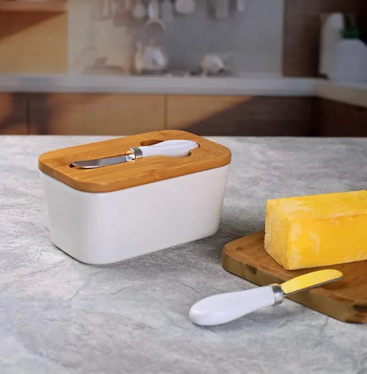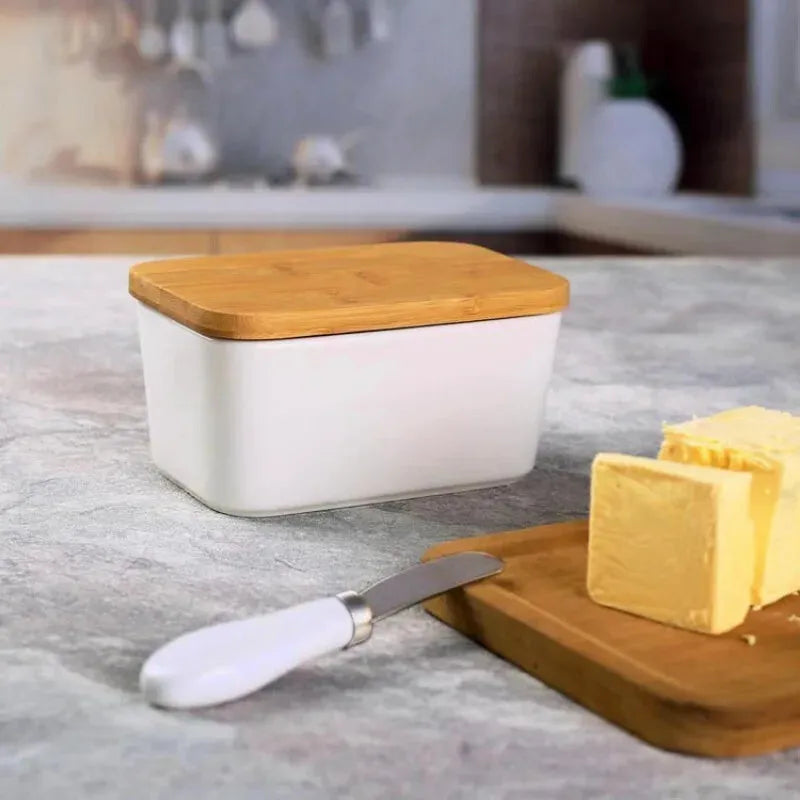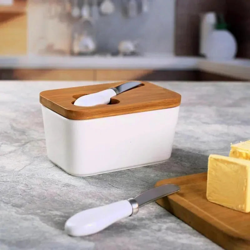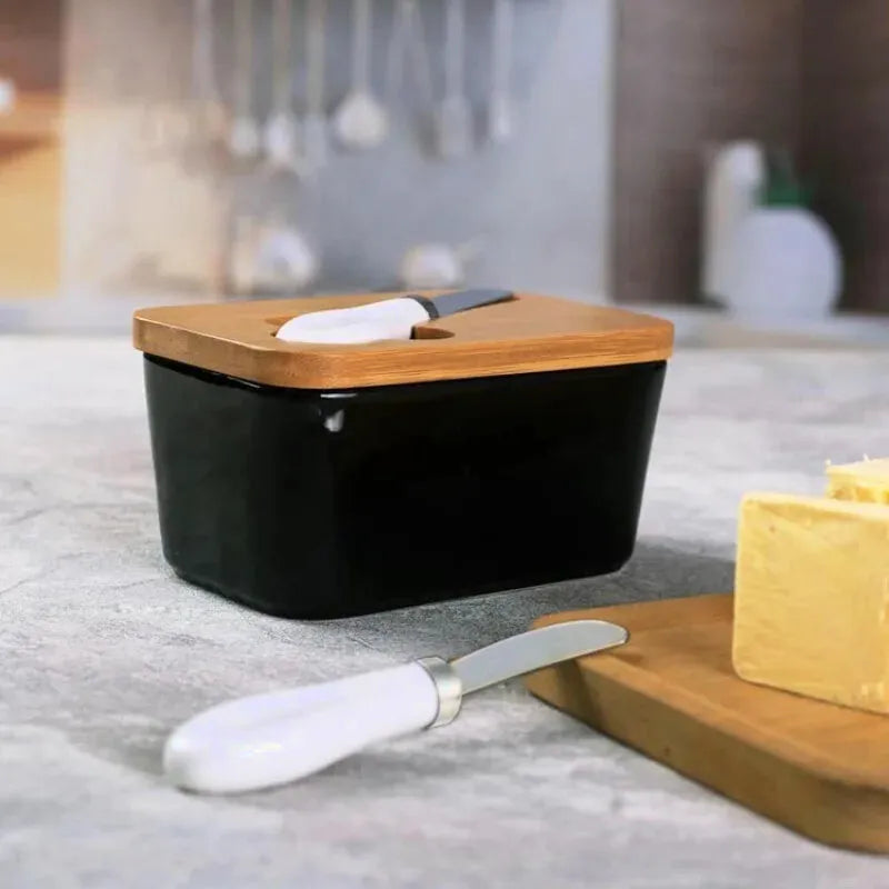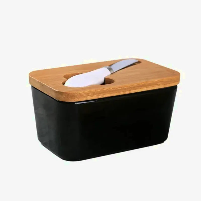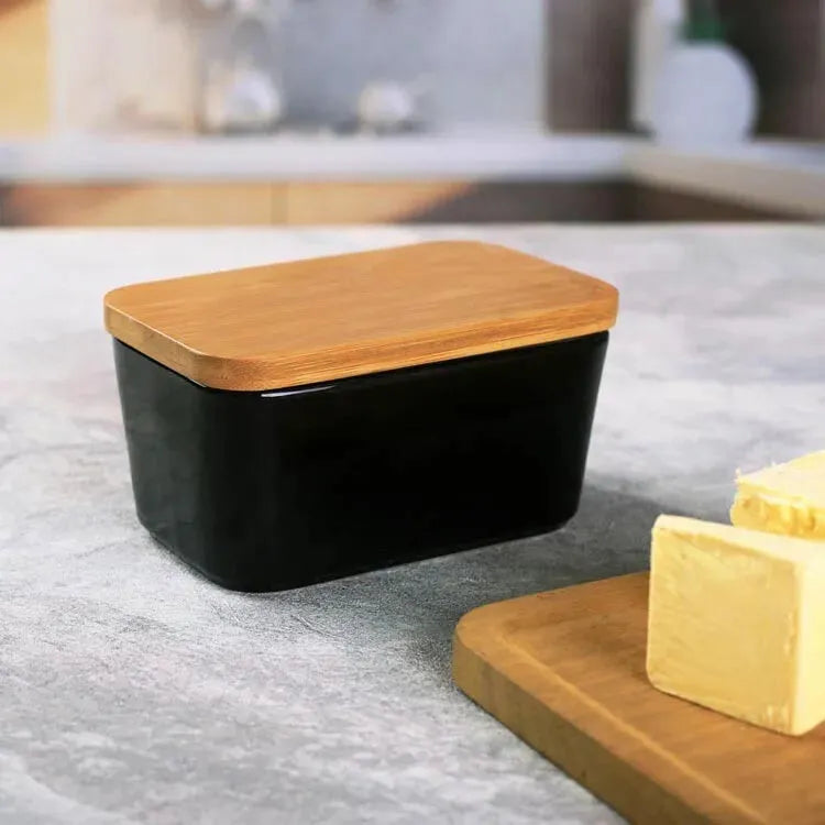 Joli beurrier en céramique avec couvercle en bambou, pratique et décoratif pour vos repas.